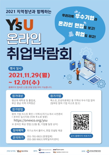 부산·울산·경남지역의 구직자들에게 실질적인 채용의 기회를 제공하는 ‘지역청년과 함께하는 YSU 온라인 취업박람회’가 오는 12월 1일까지 참가자 신청을 받는다.