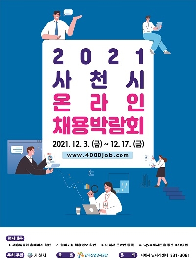 경남 사천시는 구직자와 구인기업을 위한 '2021 사천시 온라인 채용박람회'를 오는 12월 3일부터 17일까지 연다고 30일 밝혔다.