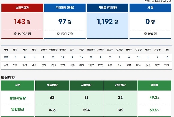 부산시 방역당국은 1일 코로나19 일일 서면 브리핑을 통해 어제 하루 동안 지역 내 코로나19 신규 확진자가 총 143명 나와 누계 1만 6393명을 기록했다고 발표했다.