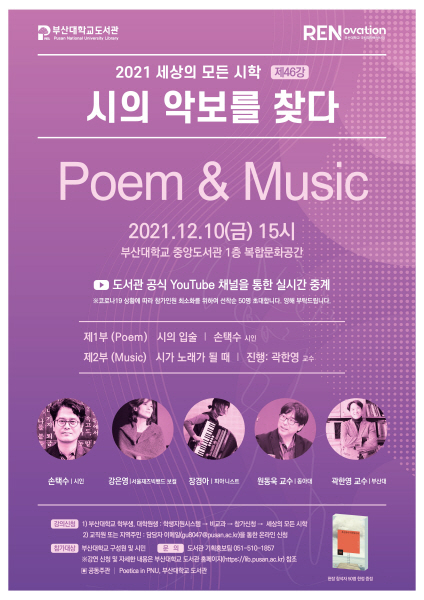 1부와 2부 각각 ‘시’와 ‘음악’으로 구성한 이번 행사는 1부(Poem) 손택수 시인의 ‘시의 입술’을 주제로 진행되는 강연에 이어, 2부(Music) ‘시가 노래가 될 때’를 주제로 서울재즈빅밴드 보컬 강은영, 피아니스트 장경아, 동아대 국제학부 원동욱 교수, 부산대 일반사회교육과 곽한영 교수가 강연·공연을 맡는다.