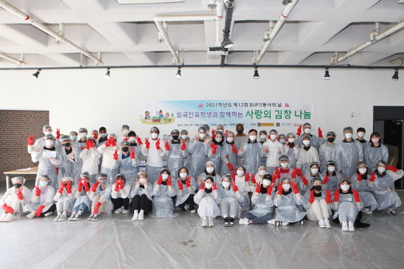 이날 행사에는 김홍구 총장을 비롯해 교직원 11명과 BUFS글로벌봉사단 및 외국인 유학생 등 학생 50명이 참여해 코로나19 방역수칙을 준수한 가운데 총 400kg의 김장김치를 담갔다.