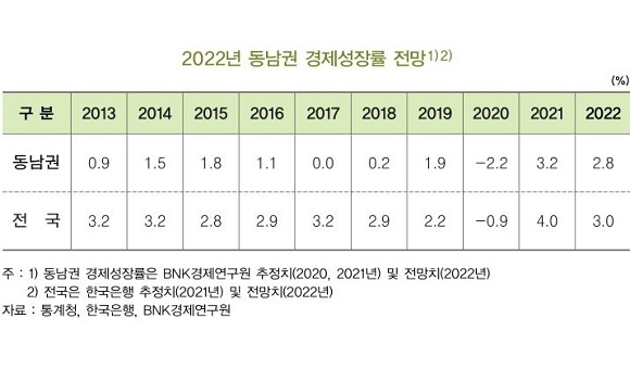 BNK금융그룹 산하 BNK경제연구원은 ‘2022년도 동남권 경제전망’ 연구 보고서를 2일 발표하고 위와 같은 전망을 내놓았다.