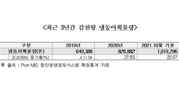 이에 코로나19 팬데믹 이전인 지난 2019년 연간 65여만톤 수준이었던 감천항의 냉동 어획 물량이 올해 1~10월 간 56.9% 증가한 101여만톤의 물동량을 처리한 것으로 나타났다.