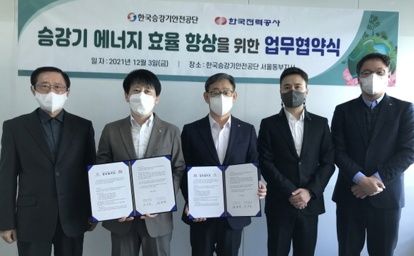 한국승강기안전공단과 한국전력공사가 승강기 회생전력장치의 재생에너지 효율 향상을 위해 3일 업무협약을 체결했다.