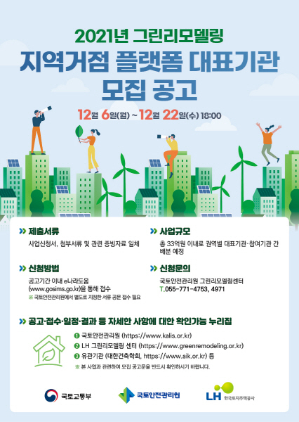 국토안전관리원은 그린리모델링 활성화와 저변확대를 위해 오는 22일까지 ‘2021년 그린리모델링 지역거점 플랫폼 대표기관’을 모집한다고 6일 밝혔다.