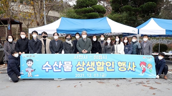 경남 사천시는 코로나19 지속 확산에 따른 수산물 소비침체로 어려움을 겪고 있는 지역 수산인과 상인들의 고통 분담을 위해 지난 3일 정읍시와 공동으로 '수산물 상생할인' 행사를 가졌다.