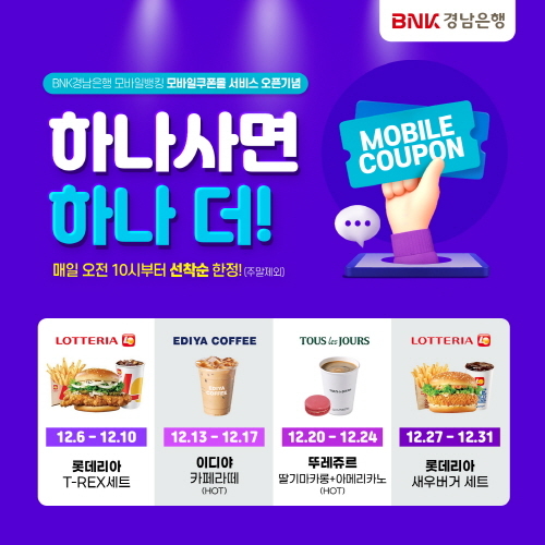 경남은행은 서비스 시행을 기념해 오는 31일까지 ‘1+1 이벤트’를 진행한다. 모바일쿠폰몰 서비스를 이용해 평일 오전 10시 이후 이벤트 상품을 구매하면 선착순 50명에게 동일 상품을 다음 영업일에 1개 더 지급한다. 6일부터 10일까지는 선착순 60명에게 지급한다. 경남은행 모바일뱅킹을 이용하는 고객이라면 누구나 1일 1회 참여할 수 있다.