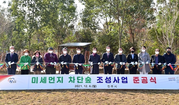 경남 진주시는 6일 오전 문산읍 삼곡리 980-3번지 일원의 문산1공원 잔디광장에서 '미세먼지 차단숲 조성사업' 준공식을 가졌다.