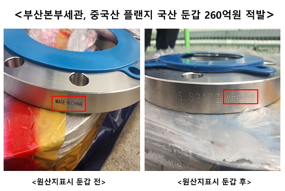 부산세관은 원산지 표시 단속을 시행해 국산으로 원산지를 둔갑한 플랜지 수입업체 9개사의 물품 총 76만점(260여억원 상당)을 적발했다고 7일 밝혔다.