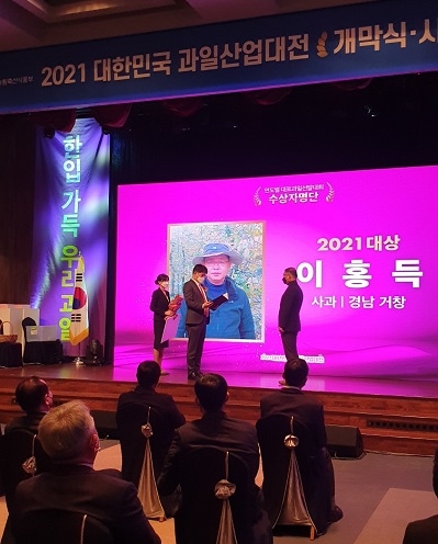경남 거창군은 지난 6일 서울 양재동 aT센터에서 열린 2021년 과일산업대전 대표과일 선발대회 시상식에서 남하면 이홍득 농가(후지 출품)가 전국 1위에 빛나는 '대상'을, 웅양면 최옥수 농가(아리수 출품)는 '장려상'을 차지했다고 7일 밝혔다.