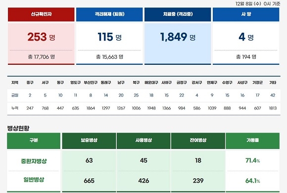 부산시 방역당국은 8일 코로나19 일일 서면 브리핑을 통해 어제 하루 동안 지역 내 코로나19 신규 확진자가 총 253명 나와 누계 1만 7706명을 기록했다고 발표했다.