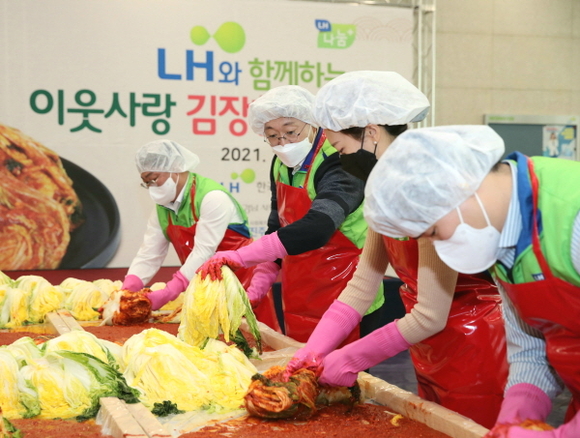 한국토지주택공사(이하 LH)가 김장김치 55t, 1만 6000포기를 약 1만 1000여 세대에 5kg씩 전달한다. LH는 8일 진주 본사에서 2021년 '이웃사랑 김장한마당' 행사를 개최했다고 밝혔다.