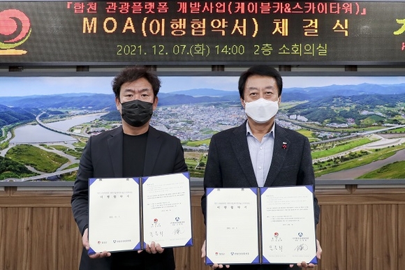 경남 합천군은 지난 7일 군청 소회의실에서 (주)합천관광플랫폼 신정범 대표이사와 문준희 군수가 참석한 가운데 '합천 관광플랫폼 개발사업(케이블카&스카이타워)'에 대한 투자이행 협약(MOA)를 체결했다.
