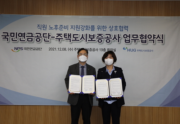 주택도시보증공사(HUG)와 국민연금공단이 지난 8일 부산국제금융센터(BIFC)에서 ‘HUG 임직원 노후준비 지원 위한 업무협약’을 체결했다고 9일 밝혔다.