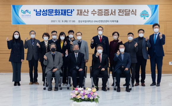 경상국립대학교(GNU)는 지난 9일 오후 5시 가좌캠퍼스 GNU컨벤션센터 3층 다목적홀에서 ‘남성문화재단 재산 수증증서 전달식’을 개최했다.