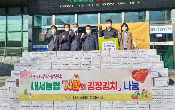 창원시 내서농협은 지난 9일 사랑의 김장김치 5kg 50박스(130만원 상당)를 내서읍행정복지센터에 전달했다고 밝혔다. 이날 전달된 김장김치는 관내 독거 어르신 등 소외계층을 대상으로 전달될 예정이다. 김진석 조합장은 “점점 추워지는 날씨에 소외된 이웃들이 김장김치 나눔 행사를 통해 온정과 희망을 가지길 바란다며, 앞으로도 지역사회 발전과 따뜻한 나눔 문화 확산에 기여하겠다”고 말했다.