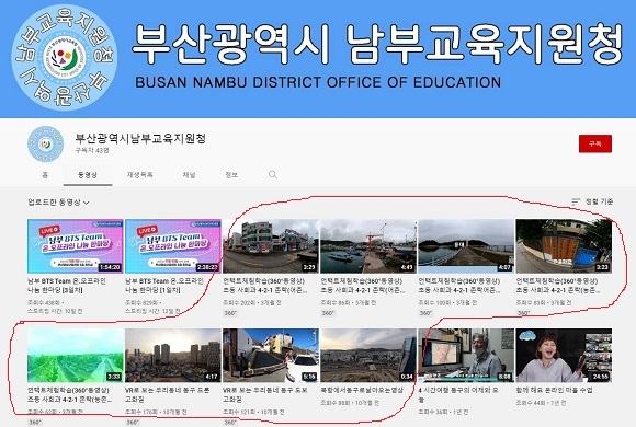 남부교육지원청은 코로나19 사태로 인해 4학년 학생의 부산지역 현장학습이 불가능한 여건을 해소하며 학습자가 시공간을 초월해 주도적으로 학습하도록 ‘부산의 생활 360도 동영상’을 제작했다. 각 학생은 남부교육지원청 공식 유튜브 채널에 접속하면 실시간으로 부산의 생활 360도 동영상 프로그램을 체험할 수 있다.