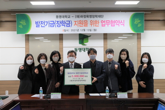 재단법인 하정육영장학재이 13일 동명대학교에 인재양성 장학금 500만원을 전달하고 관련 협약을 체결했다. 장학금은 장애 극복 의지가 강한 학생 및 장애인 지원활동을 하는 대학생 5명에 100만원씩 전달된다.
