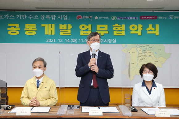 한국수력원자력(이하 한수원)이 14일 전주시청 대회의실에서 전주시, 전주시의회, 태영건설, 전북도시가스와 함께 공동개발협약을 체결, 국내 최초로 바이오가스를 활용한 수소융복합사업을 본격 추진한다.