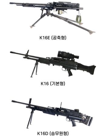 K16은 기본형과 공축형인 ‘K16E’, 승무원형인 ‘K16D’ 3개 종류로 출하했다. 그중 K16D 기관총은 육군 전차, 장갑차, 헬기와 해군 함정, 공군 헬기, 해병대 장갑차 등에서의 작전 운용 평가까지 모두 마쳤다.