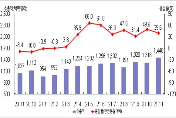 그중 부산의 지난달 수출 성적은 전년동월대비 39.6% 증가한 14억 4800만 달러를, 수입은 28% 증가한 14억 300만 달러를 기록하며 무역수지 4500만 달러 흑자를 기록했다. 이로써 부산지역 수출액은 지난 2017년 9월 이후 4년 2개월 만에 14억 달러를 넘어서게 됐다.