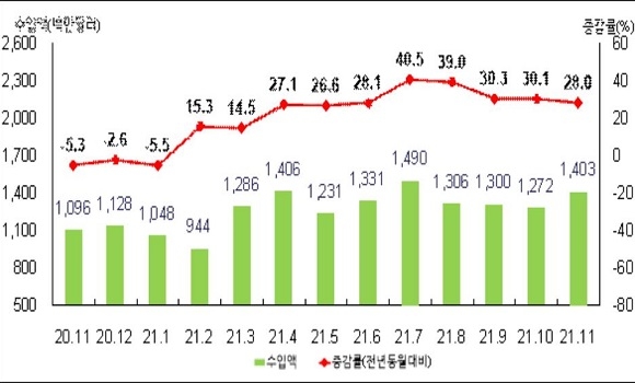 또 수입 현황은 수출 호조와 내수 회복에 힘입어 원자재(40.0%), 소비재(28.1%), 자본재(12.0%) 등이 늘며 전년동월대비 28.0% 증가해 10개월 연속 두 자릿수 증가세를 이었다.