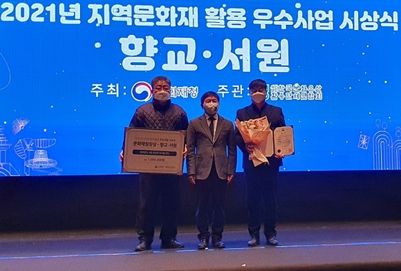 경남 밀양시는 15일 문화재청이 주최하고 한국문화유산활용단체연합회에서 주관한 '2021년 지역문화재활용 우수사업' 시상식에서 향교·서원 문화재 활용사업 분야에 2년 연속 우수사업으로 선정돼 문화재청장상을 수상했다고 밝혔다.