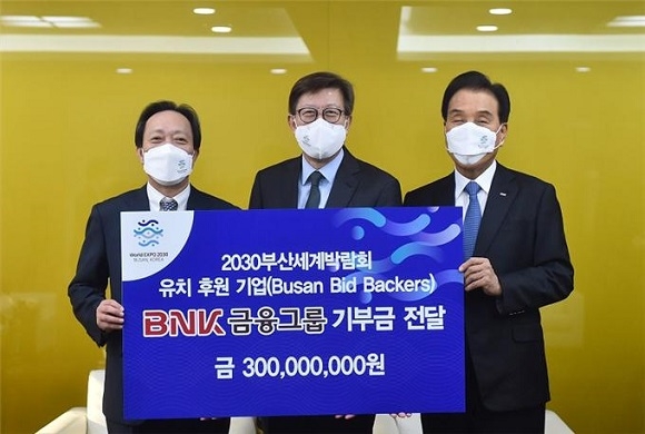 BNK금융그룹이 지난 15일 오후 부산시청을 찾아 부산시에 ‘2030 세계박람회 부산 유치 후원금’ 총 3억원을 기부했다고 16일 밝혔다.