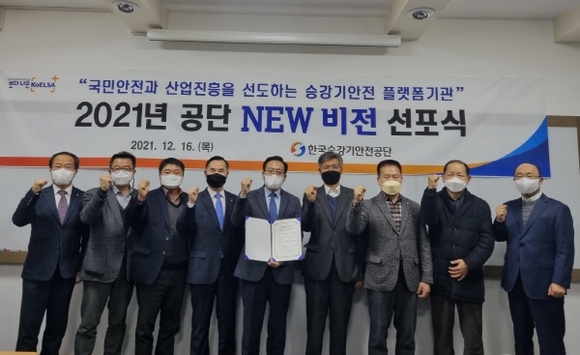 한국승강기안전공단이 ‘국민안전과 산업진흥을 선도하는 승강기 안전 플랫폼 기관’이라는 새로운 비전을 16일 선포했다. 코로나19 확산 방지를 위해 임원과 노동조합 등 최소 인원만 참석하고 직원들은 온라인으로 참여했다.
