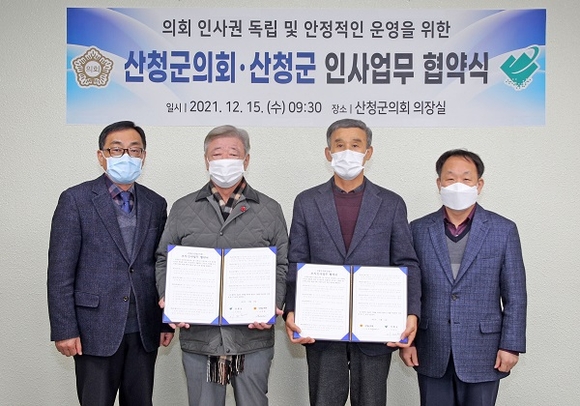 산청군의회는 지난 15일 내년부터 시행하는 지방의회 인사권 독립에 따른 안정적인 조직운영을 위해 산청군과 업무협약을 체결했다.
