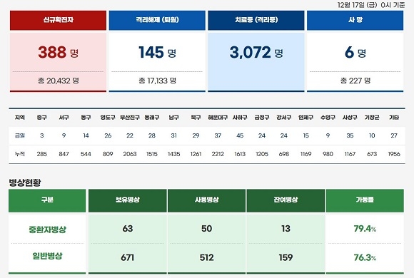 부산시 방역당국은 17일 코로나19 일일 서면 브리핑을 통해 어제 하루 동안 지역 내 코로나19 신규 확진자가 총 388명 나와 누계 2만 432명을 기록했다고 발표했다.