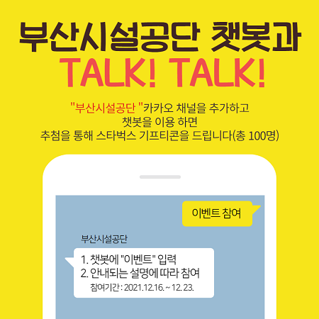 참여 방법은 부산시설공단 카카오톡 채널을 추가한 뒤 챗봇에 ‘이벤트’ 키워드를 입력하거나 메뉴를 누른 뒤 안내에 따라 참여하면 된다.