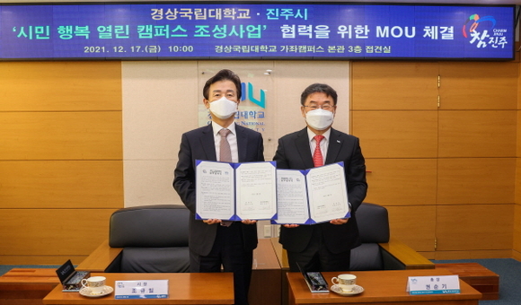 경상국립대학교(GNU)와 진주시는 17일 오전 10시 가좌캠퍼스 접견실에서 ‘시민 행복 열린 캠퍼스 조성사업을 위한 업무협약’을 체결했다고 밝혔다.