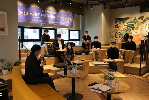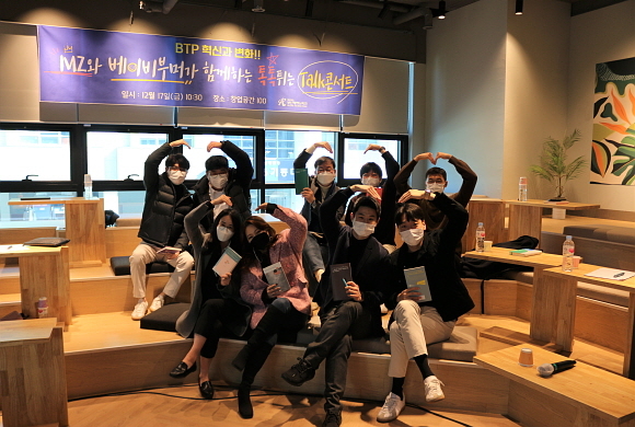 부산테크노파크가 지난 17일 부산 창업공간100에서 ‘MZ-베이비부머가 함께하는 톡톡 튀는 토크콘서트’를 연 가운데 참석자들이 기념촬영하고 있다. (사진=부산테크노파크 제공)