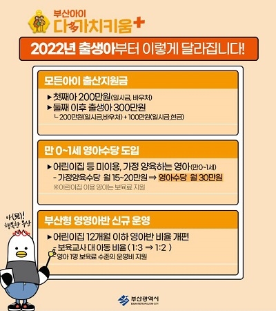 이는 그간 둘째 이후 출생 자녀에 집중돼 있던 기존 부산시의 출산 지원사업을 개편해 첫째아부터 실질적 양육비를 지원하며 둘째 이후 지원도 더 두텁게 하기 위해 통합, 확대한 것이다. 이에 기존 출산 축하용품 지원(10만원 상당) 사업과 둘째아 이후 초등학교 입학 축하금(20만원) 사업은 올해를 끝으로 종료된다.