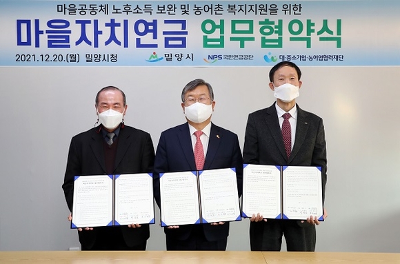 경남 밀양시는 20일 국민연금공단, 대·중소기업·농어업협력재단과 마을자치연금 사업 도입을 위한 업무협약을 체결했다.