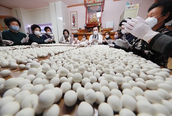 동지(冬至)를 하루 앞둔 21일 경남 함양군 금선사에서 서춘수 군수와 신도들이 동지 팥죽에 들어갈 새알을 정성스레 빚고 있다. (사진=함양군 제공)