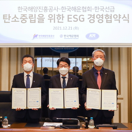 한국해양진흥공사와 한국선급이 지난 21일 한국선급 부산 본사에서 한국해운협회와 함께 ‘탄소중립 위한 ESG(Environment Social Governance) 경영’ 협약을 체결했다고 22일 밝혔다.