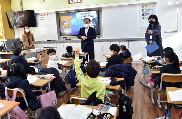 지난 21일 김석준 부산시교육감(맨 앞 중앙)이 동래구 소재 명동초등학교를 방문해 학사일정과 방역상황 등을 점검한 뒤 학생들과 만남의 시간을 보내고 있다. 부산시교육청에 따르면 이날 김석준 시교육감은 명동초등학교 외에도 동래구에 위치한 혜화초등학교 등 일대 초등학교를 잇따라 방문해 방역 상황을 집중 점검했다. (사진=부산시교육청 제공)