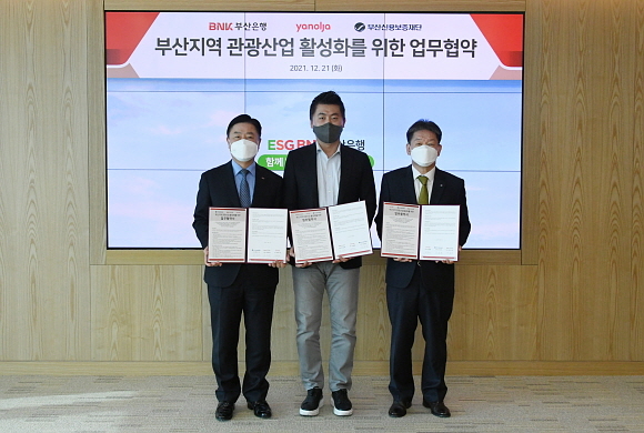 BNK부산은행과 부산신용보증재단(부산신보재단)이 지난 21일 부산은행 본점에서 ‘야놀자’와 함께 ‘부산지역 관광산업 활성화 위한 업무협약’을 체결했다고 22일 밝혔다.