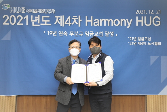 주택도시보증공사가 지난 21일 ‘4차 Harmony HUG(노-사 협의회)’를 열고 노동조합(노조)과 올해 임금 협약을 체결했다고 22일 발표했다.