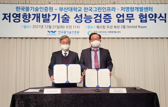 양 기관은 지난 21일 오후 부산 웨스틴조선호텔에서 ‘저영향개발기술 성능검증 수행'에 관한 업무협약을 체결하고, 관련 분야 우수 제품 및 기술의 시장진입과 국내·외 판로개척 지원을 위한 저영향개발기술 성능검증제도를 함께 추진하기로 했다.