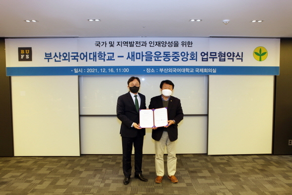 부산외국어대학교는 지난 16일 새마을운동중앙회와 국가 및 지역발전과 인재양성을 위해 업무협약 체결식을 가졌다고 23일 밝혔다.