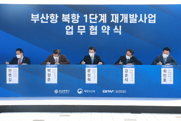 부산항만공사(BPA)와 부산시가 23일 해양수산부(해수부)와 ‘부산 북항 1단계 재개발사업’에 대한 구체적인 조율안을 합의해 결정짓는 협약을 체결했다.