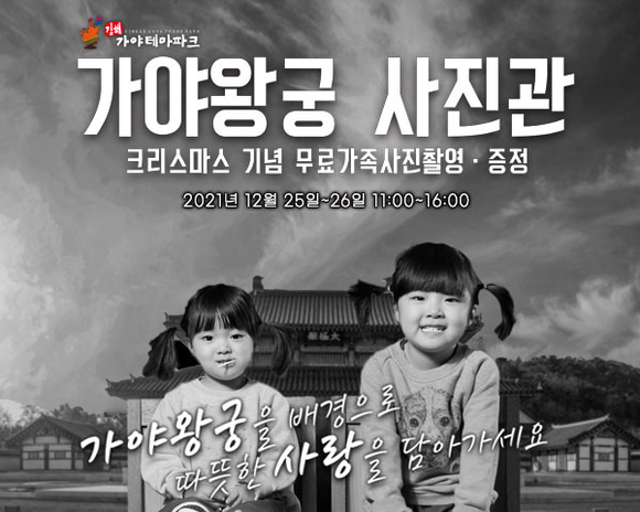 가야테마파크는 전문 사진작가가 가야왕궁을 배경으로 특별한 스냅사진을 찍어주는 ‘가야왕궁 사진관’을 25일과 26일 양일간 운영한다고 23일 밝혔다. 이번 행사는 가족, 연인, 친구 등 2인 이상 방문객을 대상으로 하루 선착순 500팀을 대상으로 무료로 진행된다.