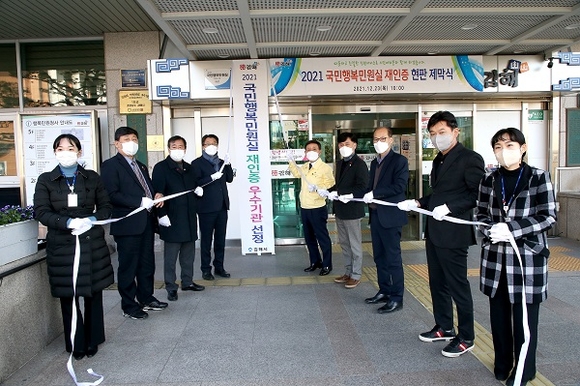 경남 김해시는 지난 23일 시청 민원실 입구에서 허성곤 시장, 송유인 시의장 등이 참석한 가운데 '국민행복민원실' 재인증 현판 제막식을 가졌다.
