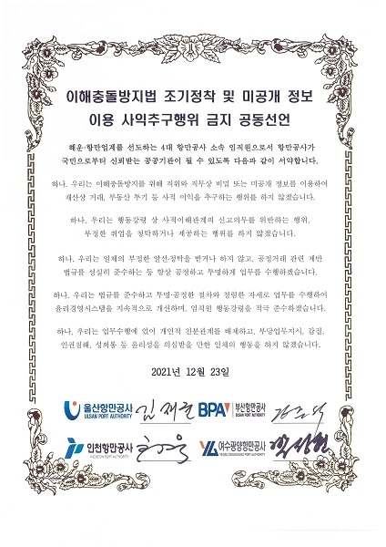 울산항만공사(이하 UPA)는 이해충돌 없는 청정항만을 만들기 위해 지난 23일 부산항만공사, 인천항만공사, 여수광양항만공사와 ‘이해충돌방지법 조기정착 및 미공개 정보 이용 사익추구행위 금지’ 공동 협약을 체결했다. 협약은 코로나19 확산 방지를 위해 비대면으로 체결했다.