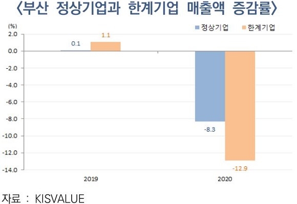 부산 소재 한계기업의 매출액은 지난 2019년 1.1% 증가세를 기록했으나 지난해에는 전년대비 12.9% 감소한 것으로 확인됐다. 정상 기업이 지난해 매출 8.3% 감소세를 기록한 것에 비해 감소 폭이 더 크게 나타났다.