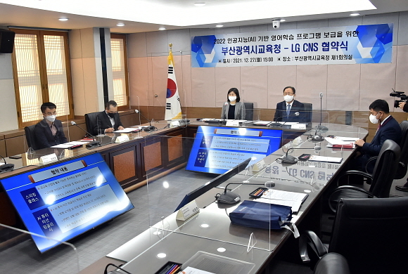 부산시교육청이 지난 27일 오후 시교육청 본관 제1회의실에서 LG CNS와 함께 ‘인공지능(AI) 기반 영어 학습 프로그램 보급’ 협약을 체결했다고 28일 밝혔다.