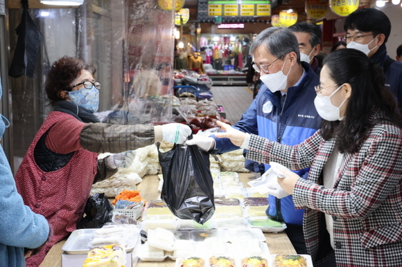 이날 정재훈 사장을 비롯한 임직원은 이날 코로나19 상황에서 정부 방역지침을 준수하며 성동시장과 중앙시장을 방문, 600만원 상당의 물품을 구매해 경주시 지역아동센터 12곳에 전달했다.